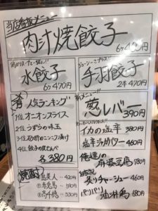 1)看板メニュー「肉汁餃子」を強く押している。勿論、店名もそうですが、入口、壁、メニュー等彼方此方、餃子の風景が見える。